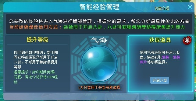 ·当气海中存在经验时,可将经验用于提升等级,如等级已达到封印上限,则使用美酒、花露、青龙令将获得150%的经验加成。