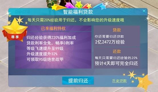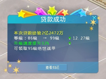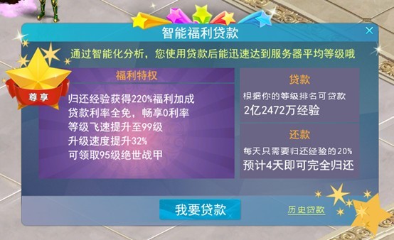 呼出“经验贷款”界面后,可以查看到本次进行贷款后可升至的等级,以及还贷过程中的福利加成系数。
