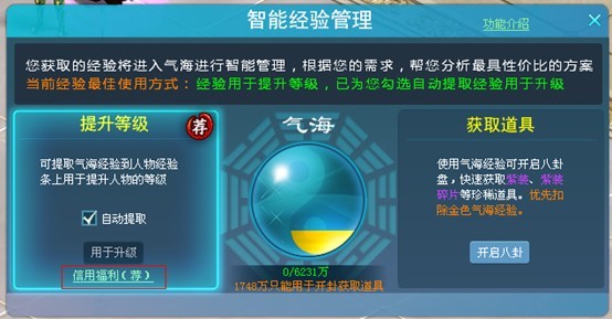 气海界面的左侧,升级按钮下方有下划线点开“信用福利”,可以开启“经验贷款”界面。