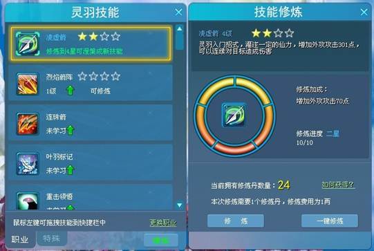 ·使用道具历炼丹可增加技能的修炼值,随着修炼值的积累,技能星数会获得提升,最高为七星。