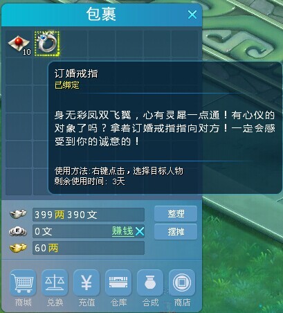 2、右键点击“订婚戒指”指向你的另一半。对方同意后,即订婚成功。