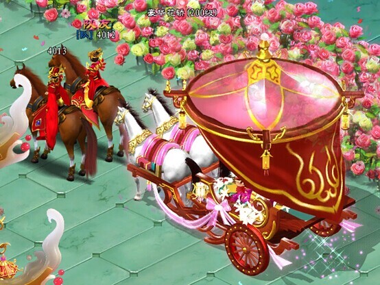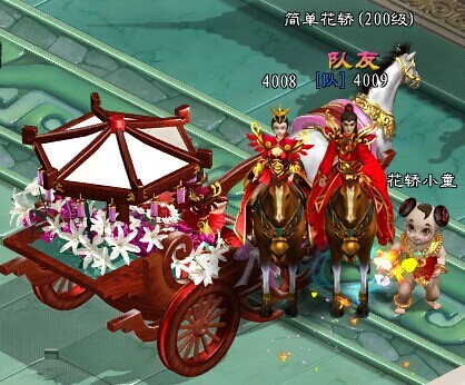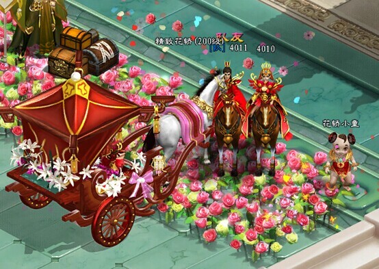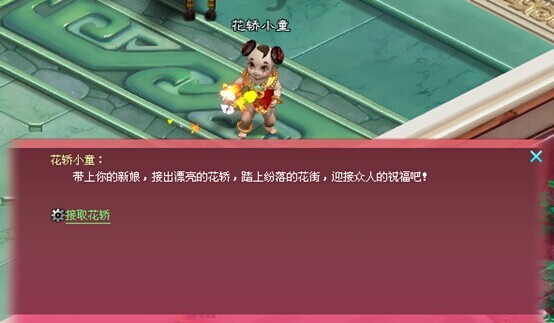 在王城-花轿小童(332,330)处(豪华婚礼在神州-花轿小童(509,595)处接取),由男方接取花轿,男女双方共同拉到王城-王总管(193,191)处(豪华婚礼需拉到神州-红娘(390,494)处)。