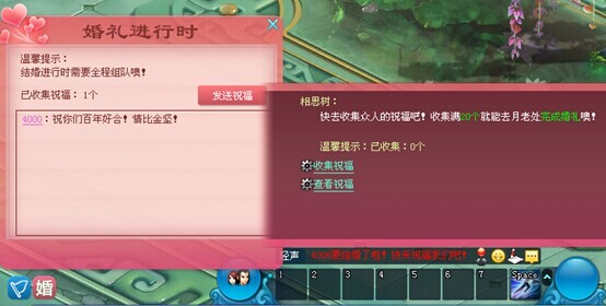 完成任务需要收集满20个祝福,新人点击“收集祝福”,就会在当前频道发送一句话,点击左下角的“婚”按钮,即使不在相思树树旁,也可随时查看收到的祝福情况。