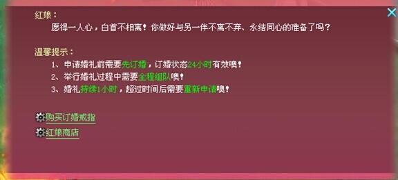 1、举办婚礼前,需要先在王城-红娘(305,330)处购买订婚戒指进行订婚。