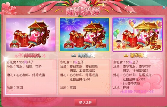 2、订婚成功后,即可申请婚礼,婚礼有3种:简单婚礼、精致婚礼、豪华婚礼,不同婚礼的氛围、赠礼等都各不相同噢!