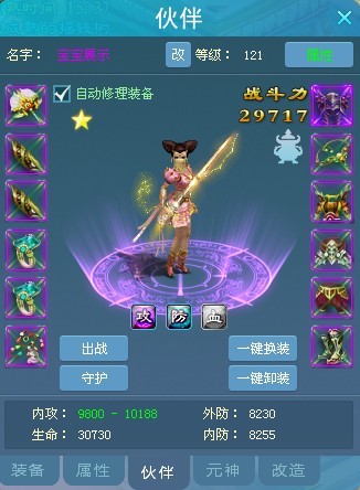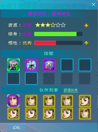 每种伙伴都自带一种攻击属性,内功、外功,可通过点化悟性激活第二个属性防御,第三个属性血量可通过幻化,将同种类伙伴的技能幻化至玩家使用的伙伴身上。