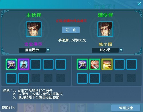 特别需要说明一点,主伙伴上想保留的技能一点要选择绑定技能,否幻化可能会将主伙伴的技能清除哦。