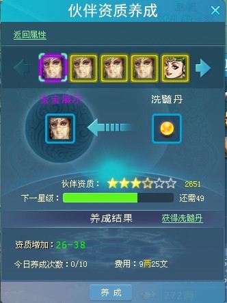 可以使用资质洗髓丹养成提升伙伴的资质,伙伴的资质越高,属性越好。