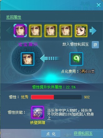可使用悟性轮回玉点化伙伴的悟性,悟性越高属性加成越高