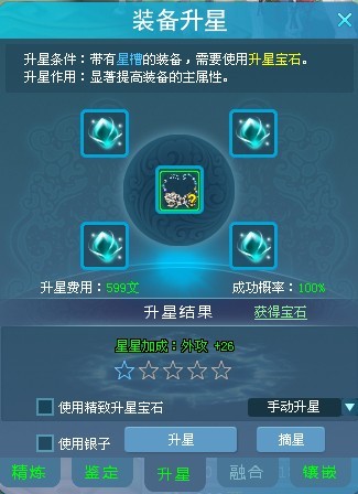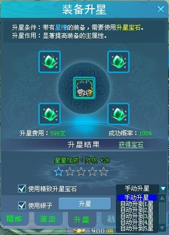 6.银卡不足或者升星宝石不足的情况下(前面这句可以直接删掉),玩家可以点击使用银子或者使用精致升星宝石的按钮,同时也可以选择自动冲星