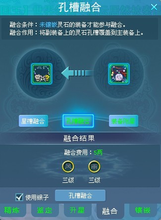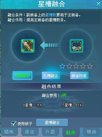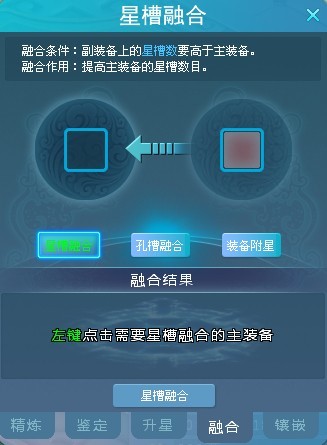 4.左键点击需要融合或者需要附星的装备放入左边的孔槽中,选择要进行的融合类型,然后左键点击符合要求的装备放入副装备格子中,然后点击融合即可。