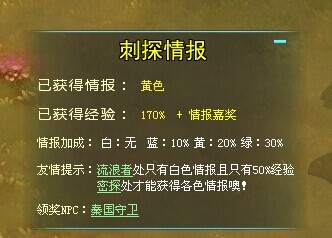 刺探,是《江湖》中别具一格的任务模式,玩家通过前往敌国后方,寻找指定NPC,并且获得情报带回自己国家的获得奖励的任务。